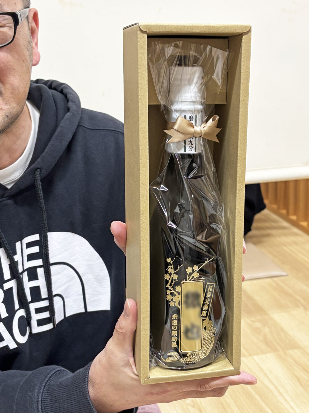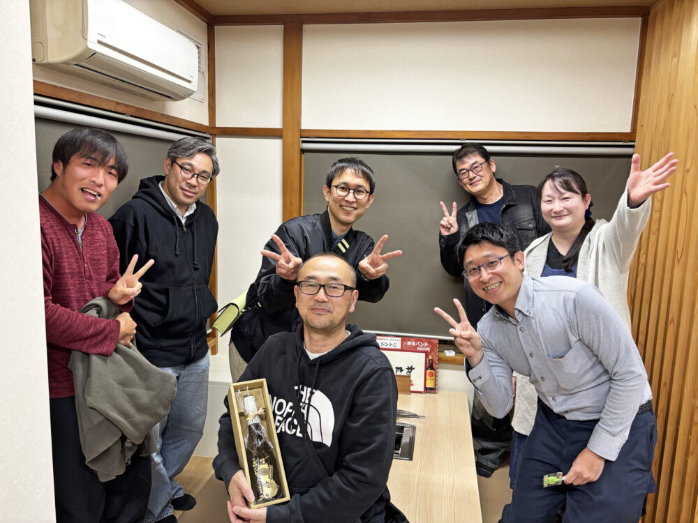 これは「お疲れ様会」を実施したいと思い、相良北薬局と同じグループの薬局長や薬局長経験者を集めて実施しました。記念品として、写真にあるお酒を送りました。